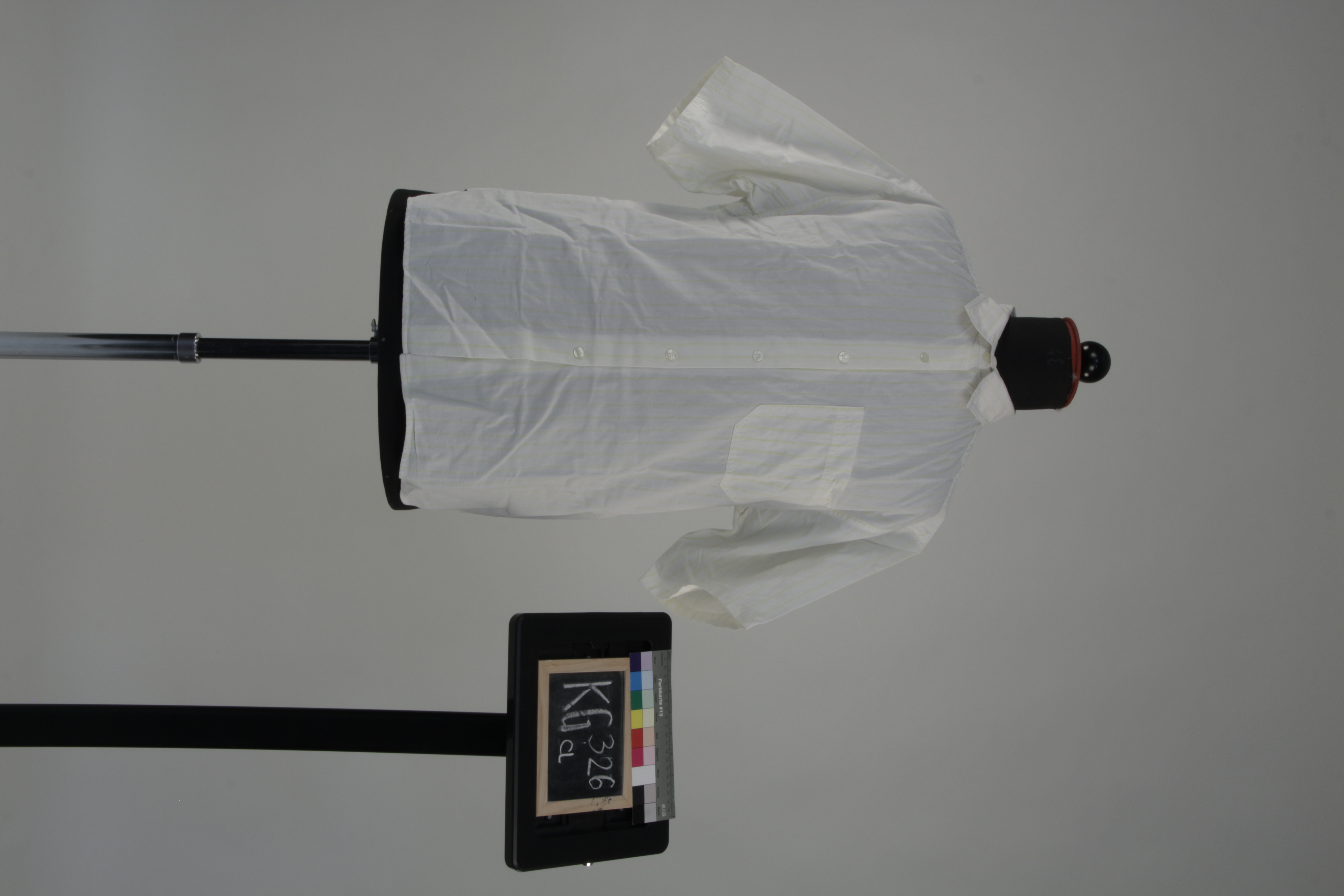 Weiße Herrenoberhemden mit türkisen bzw. gelben, horizontal-verlaufenden Streifenmuster, gelb-gestreifte Hemden hat schmale Streifen, beim türkis-gestreiften Hemd sind die Streifen ebenso breit, wie der Untergrund, linke Seite Brusttasche, Saum abgerundet, Hemden haben einen kurzen Arm, kleine helle Plastikknöpfe